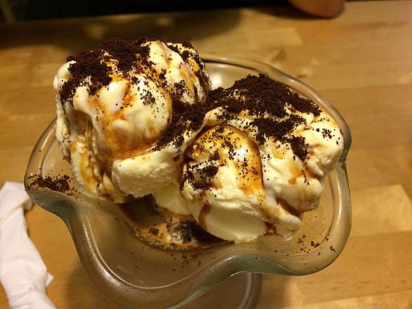 濃縮咖啡冰淇淋,用經典聖代杯裝,杯中先放2球香草冰淇淋,然後淋上濃縮咖啡,最後再灑上咖啡粉。