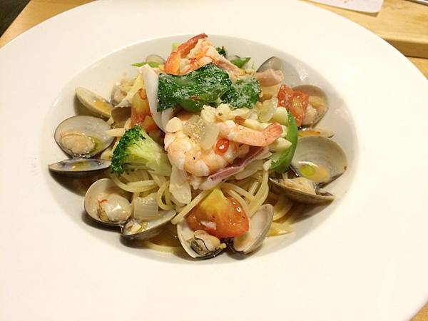 白酒海鮮義大利麵,湯汁清甜,麵也很有彈性,用料又豐富,還滿好吃的。