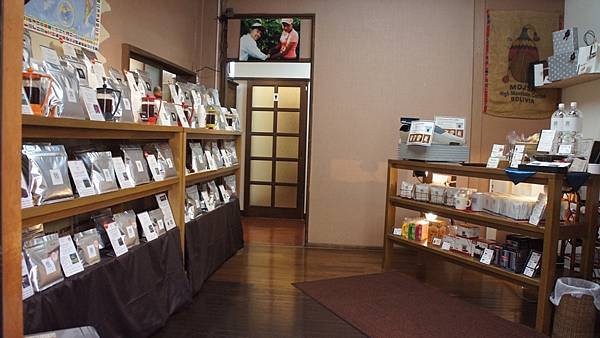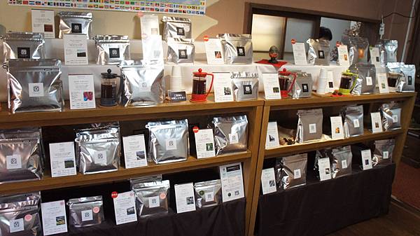 我們到的時候剛好沒位置,所以就先到販賣部參觀,這裡賣的自烘咖啡豆有好多種,現場有七種可以試喝,都是泡好了放在咖啡豆旁,可以自行用旁邊的小紙杯取用試喝。