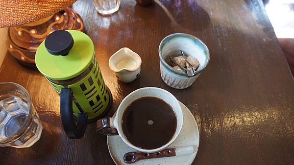 我點的丸山咖啡(深焙),是用法式濾壓壺泡的,這個壺他們店也有賣,附有咖啡糖跟牛奶,點一份他會給你一壺的量,總共大約2杯。